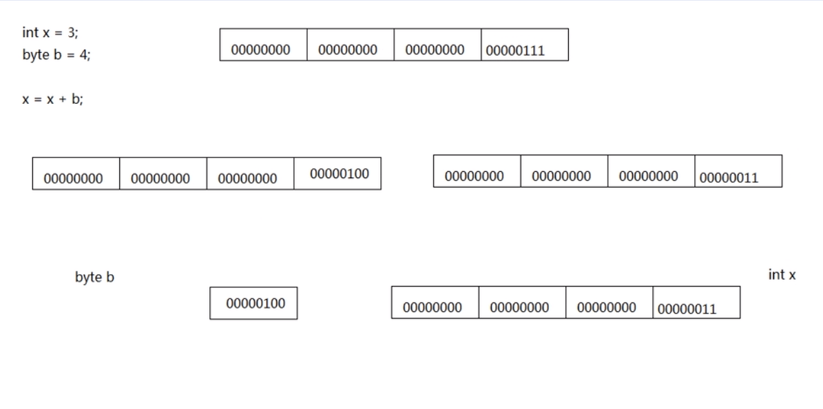 x = x + b;这里会先把byte类型转成int类型(在计算机底层)