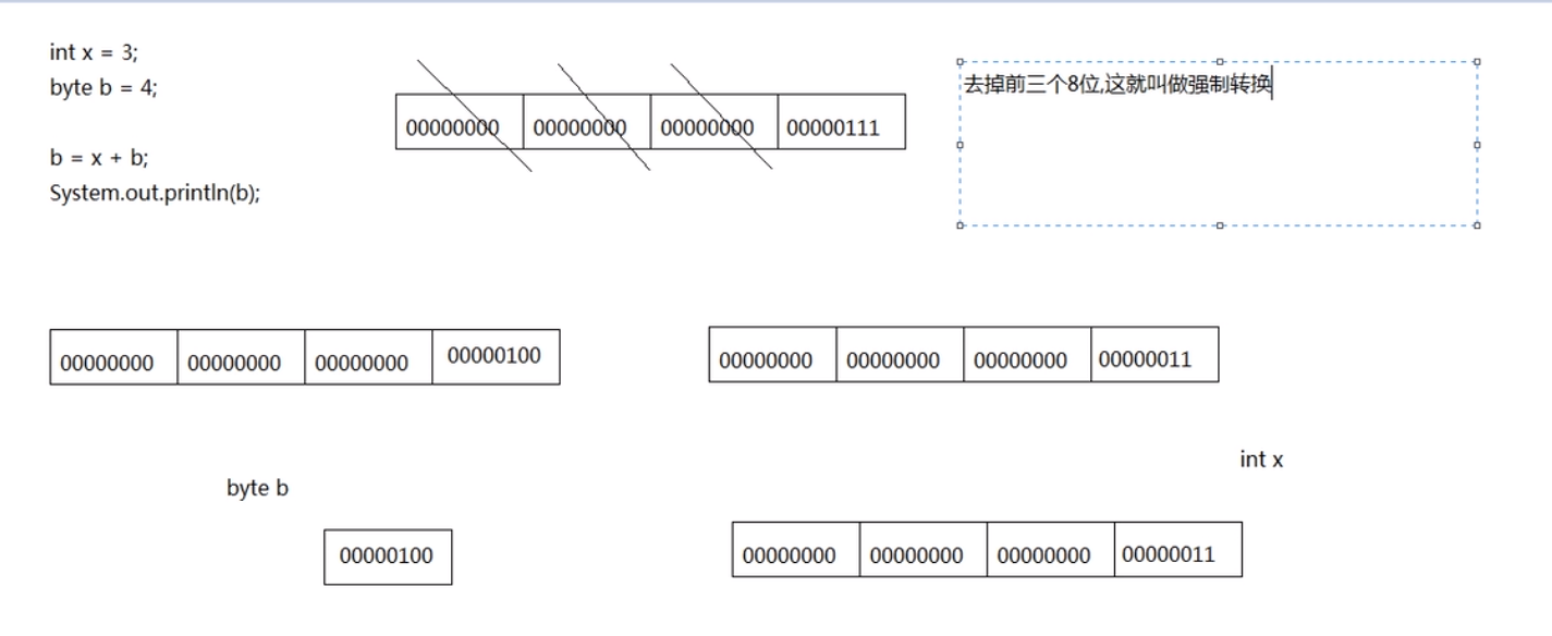 b = (byte)(x + b); //这里是大的(int)往小的(byte)里装/* ### 注意事项 1 ###