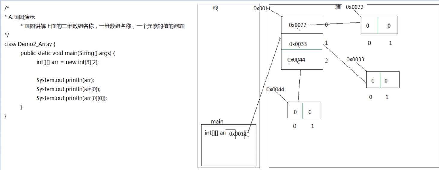 int [][] arr = new int[3][2];第一个数字3表示,有三个一维数组(行)