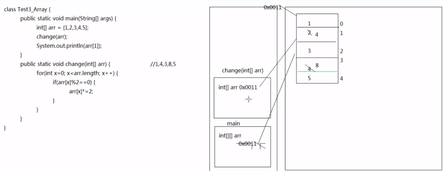 在语句int[]出现之后会在堆(heap)里产生对应的一块空间,然后调用change()方法的时候会压栈(进栈)并且吧刚才的arr传进来,这个操作是对堆(heap)内的数据进行操作,main中的arr和change中的arr都指向的是一个地址,所以这次会发生改变,里面的最后结果是[1,4,3,8,5] 而不是[1,2,3,4,5]