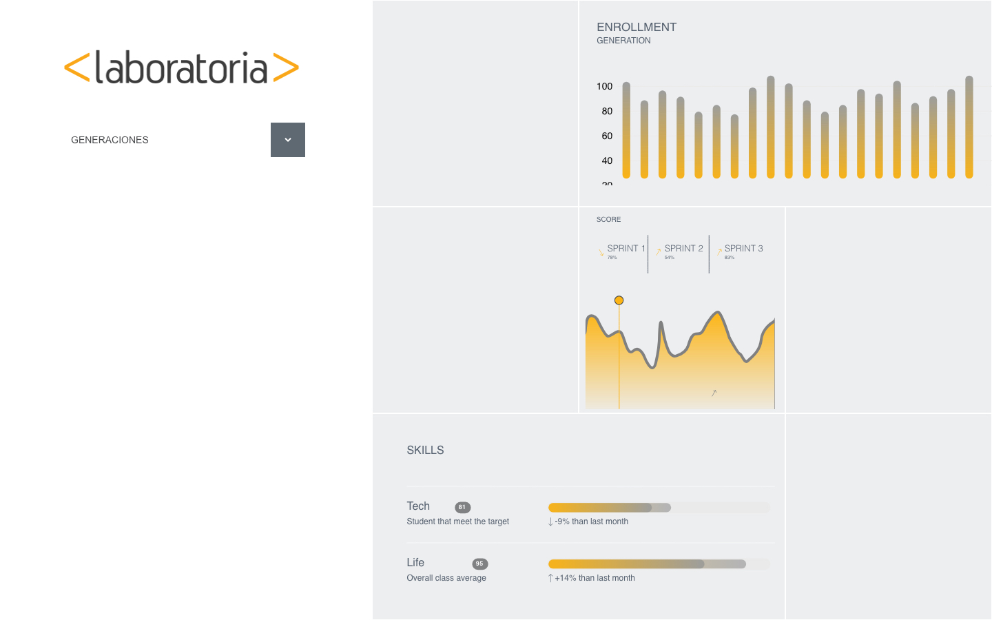 UX En este sketch se prioriza la visualización de gráficos contenida en una retícula con la intención de que fuera respondiendo al tamaño y forma de contenido de acuerdo a la correspondiente actualización de la información;con una navegación global lateral. En cuanto al tipo de representación se respetaron los códigos tipográficos y de color y uso mínimo de recursos parte del branding de Laboratoria.