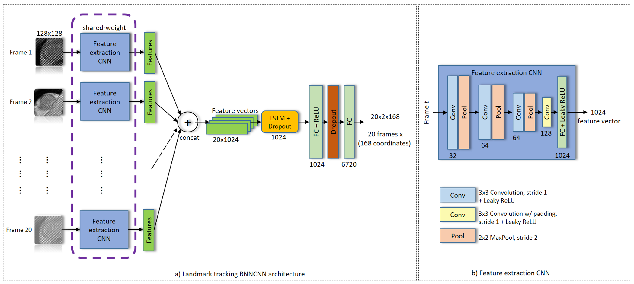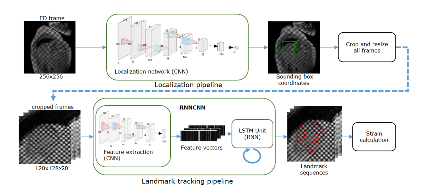 - Tracking Landmark RNNCNN it takes a sequence of MRI image (20 frames) and use shared-weight CNN to extract the spatial features of every frames, which are then passed on to the RNN to incorporate the temporal feature extraction. The RNNCNN network is trained end-to-end.