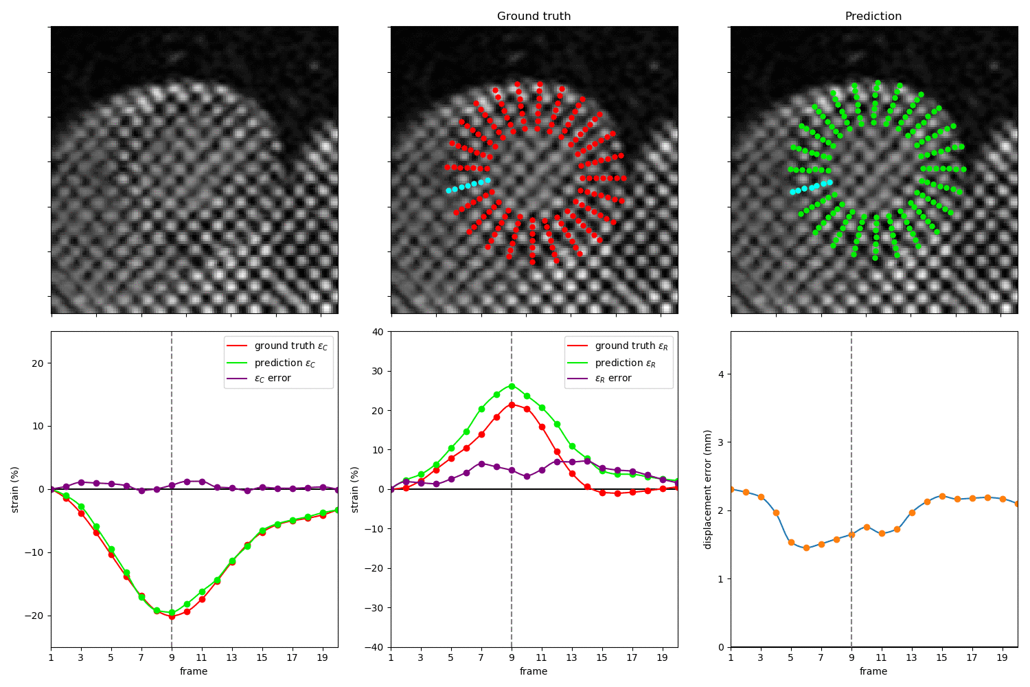 The script will run the whole prediction using the 2 networks. The first network predicts the bounding box and localize the region of interests (ROI). The ROI will then cropped and resize before passing them to the second network. The second network will predict the local landmark coordinates from the cropped frames. Finally, radial and circumferential strains are calculated.