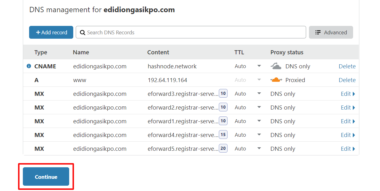 - At this point, you've successfully mapped your domain to Hashnode through Cloudflare. But you need to do one more thing to enable Cloudflare to manage your DNS records. So, click on the Continue button to proceed.