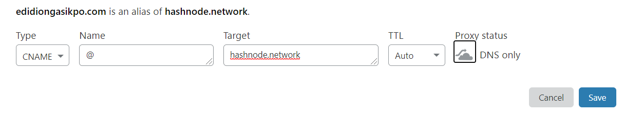 | CNAME | @ | hashnode.network | Auto | DNS Only |
