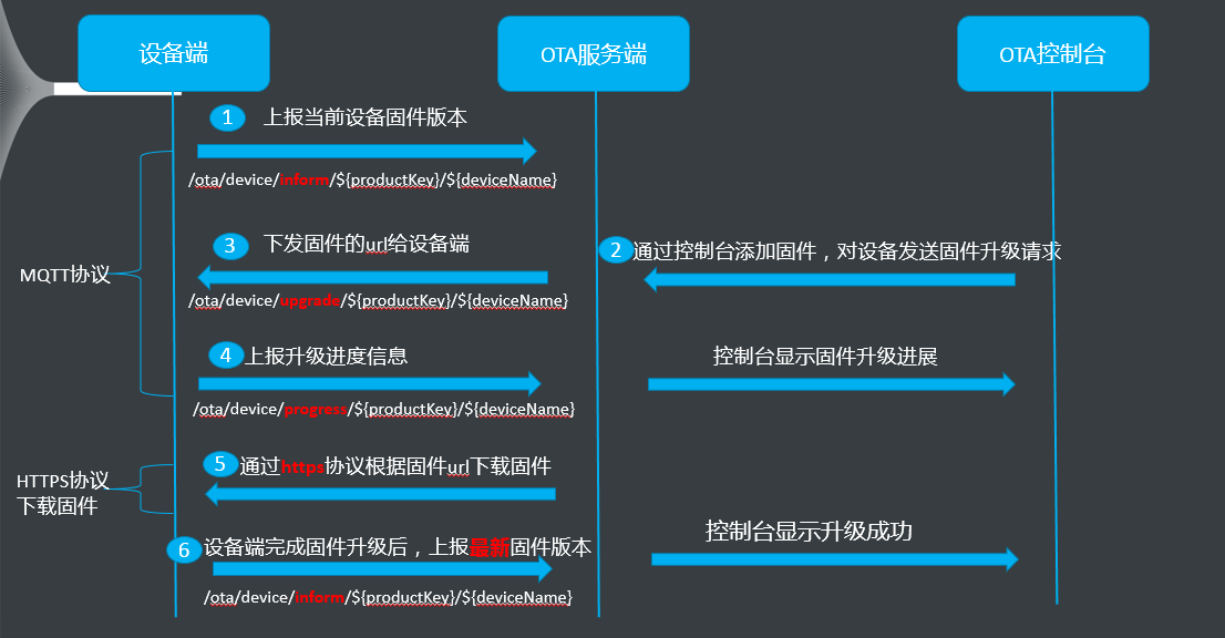 提供的 OTA 为通过 MQTT 连接进行升级,工作的流程如下: