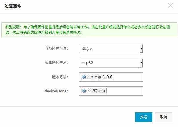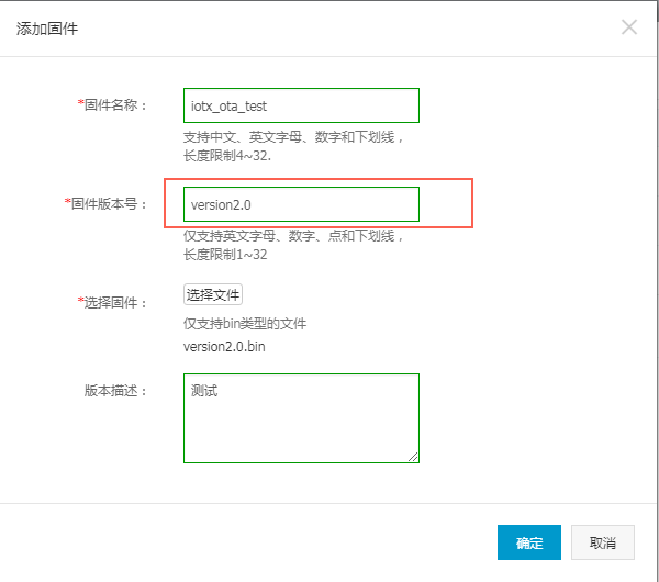 3 在IoT控制台上添加目标固件B,固件版本号填为version2.0,并推送升级