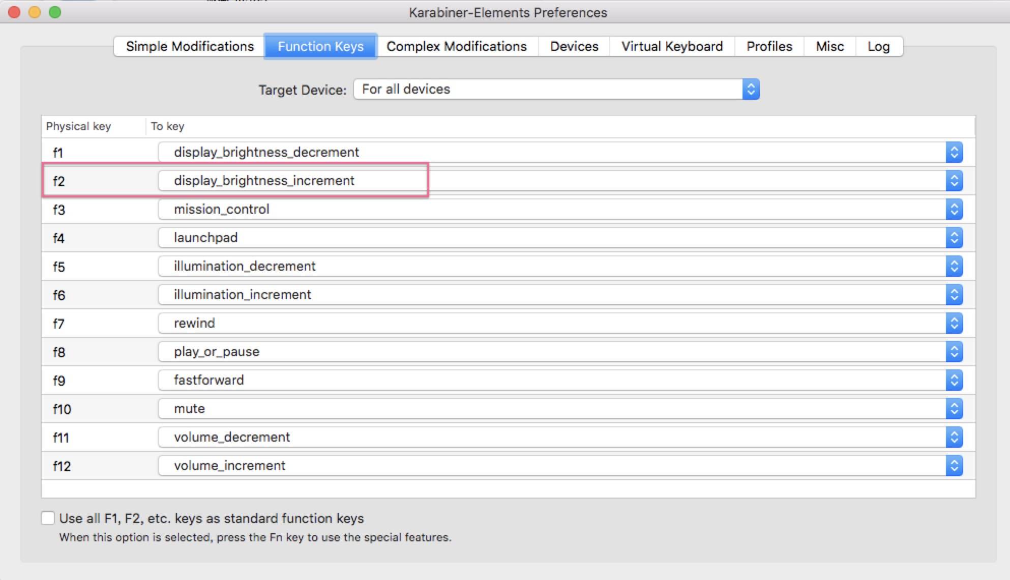 方法2:安装软件KeyRemap4MacBook,将F2键重新映射为display_brightness_increment。如下: