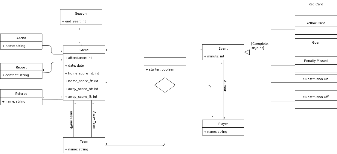 We first had to obtain the data from online sources. We decided to scrape online sports platforms, namely The Guardian and SkySports, for their completeness in game information. The UML class diagram that shows all information collected and stored can be found below.