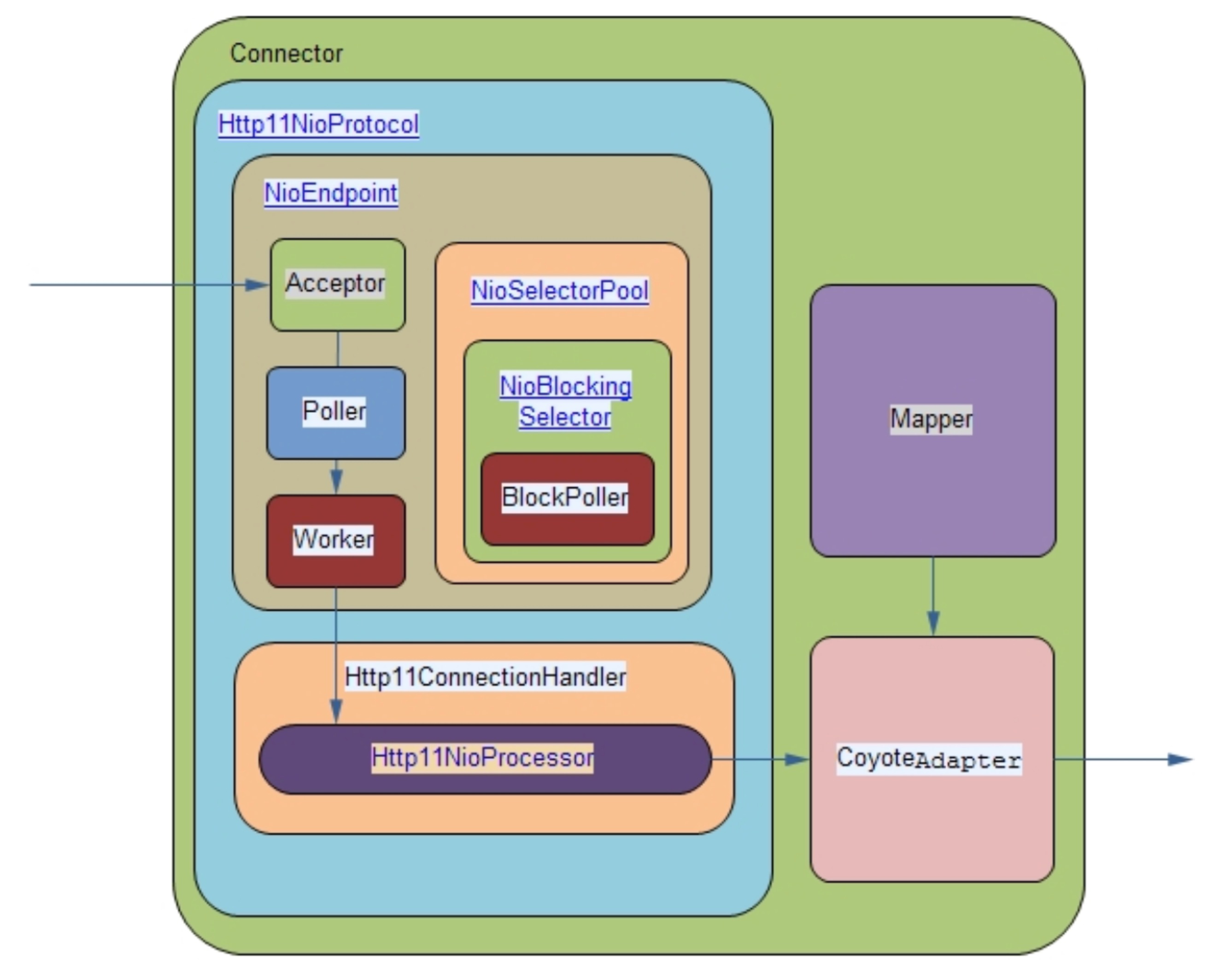 CoyoteAdapter 是 Connector 到 Container 的适配器,Http11NioProcessor 调用其提供的 service 方法,内部创建 Request 和 Response 对象,并调用最顶层容器的 Pipeline 中的第一个 Valve 的 invoke 方法