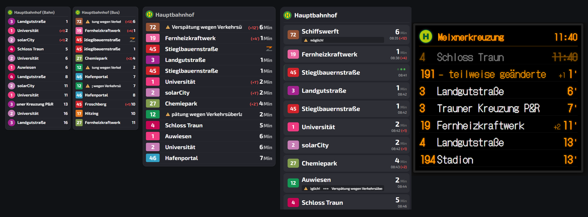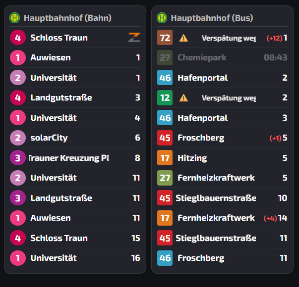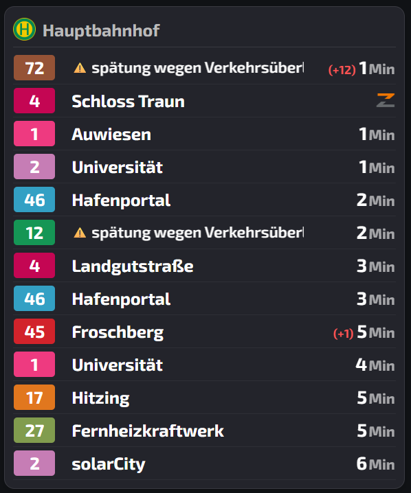 1 Universität 14:30 (5 Min)oder3 Traun (Jetzt)) – perfekt für Apple Watch oder kompakte Dashboards. - Saubere Namen & Duplikat-Filter: Unerwünschte Zusätze wie "Linz/Donau" oder "Leonding" werden aus Zielen herausgefiltert. Die clevere Suche zeigt jede Haltestelle nur noch exakt einmal an.