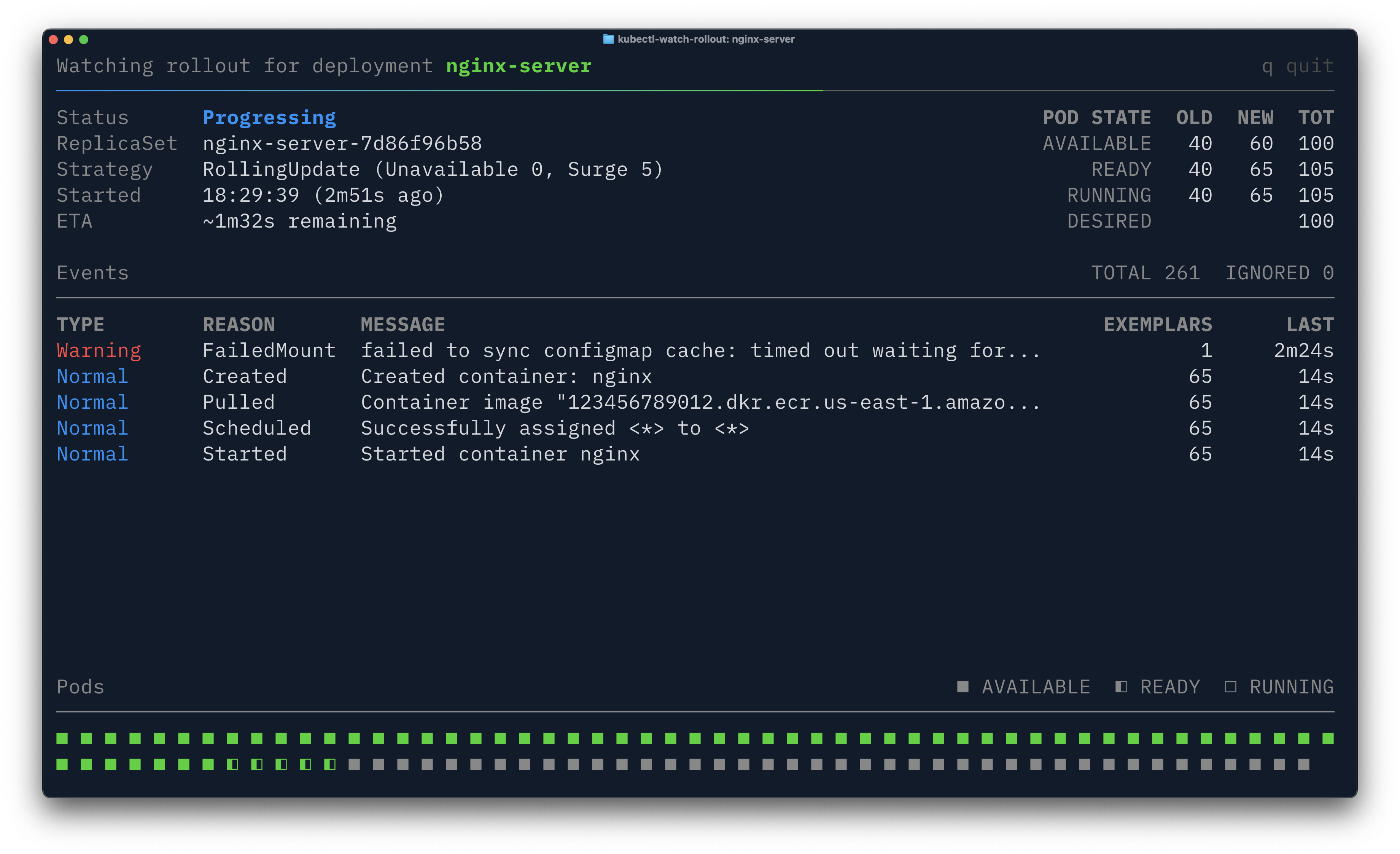 kubectl watch-rollout nginx-server --line-mode --until-complete09:40:21 ▶ [REPLICASET nginx-server-646b99584c] [ROLLOUT PROGRESSING] [NEW 5/100] [OLD 95/100] [ETA 5m15s]