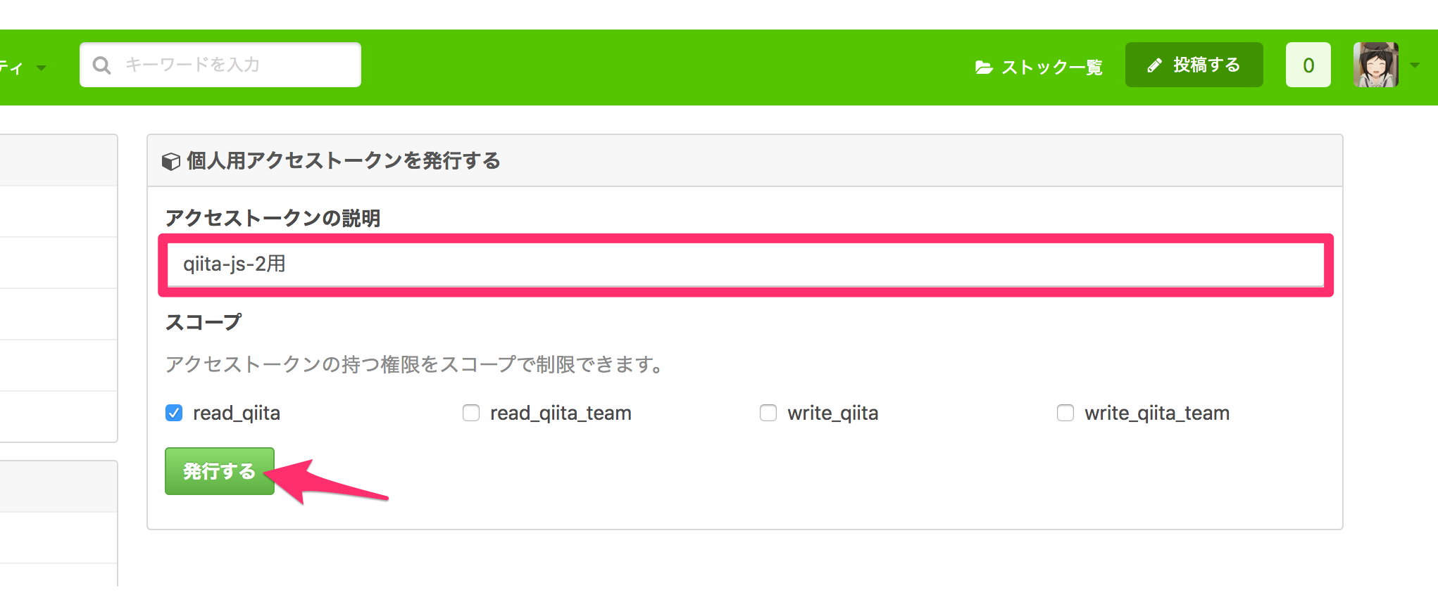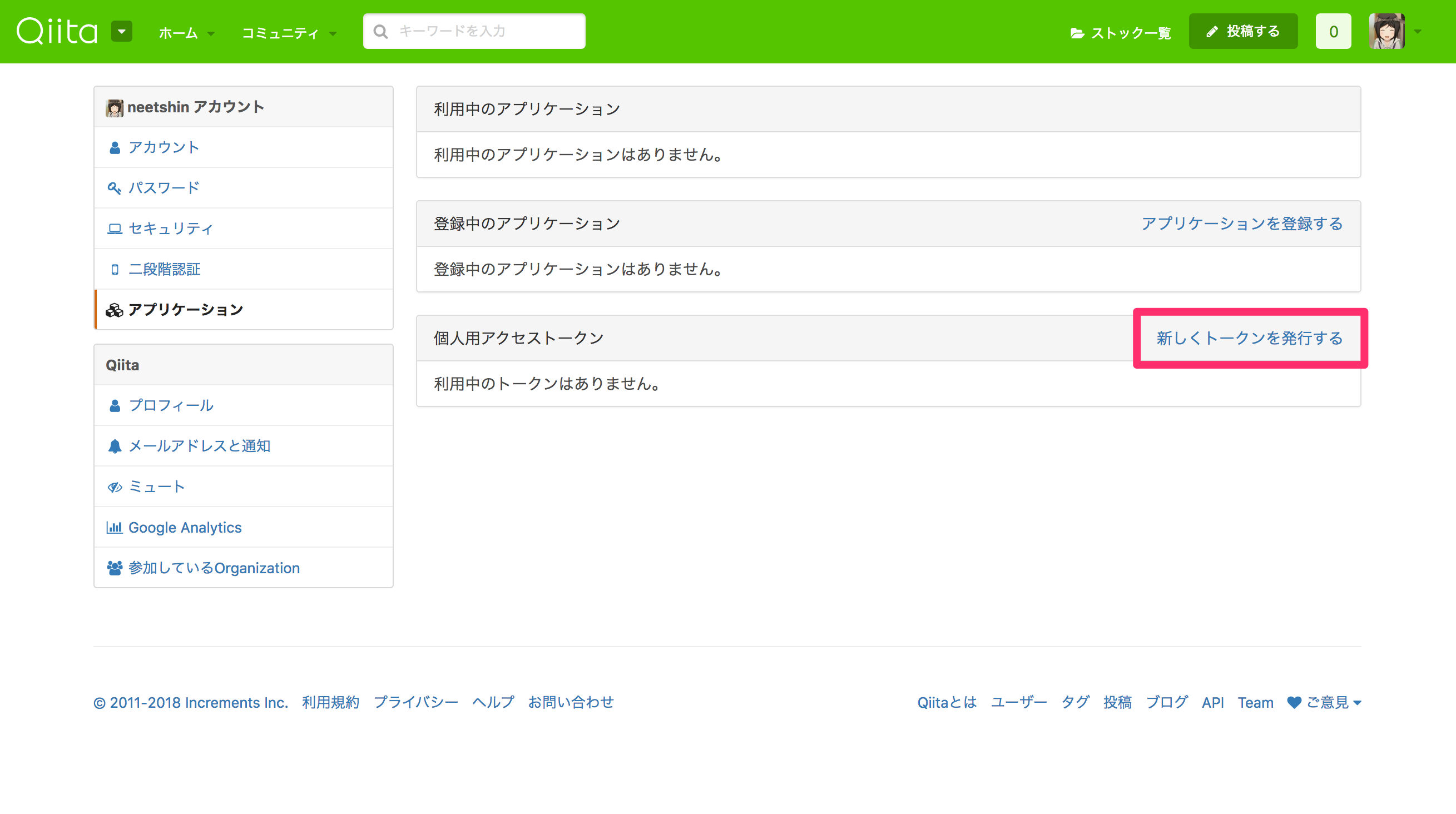 Qiitaのアプリケーションページを開き、新しいアクセストークンを発行します。