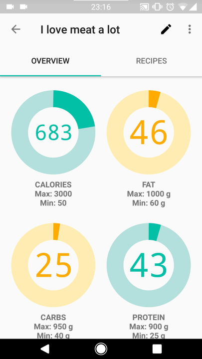 - Many diet customizations, including name, diet type, excluded ingredients, calories, fat, carbs and protein.