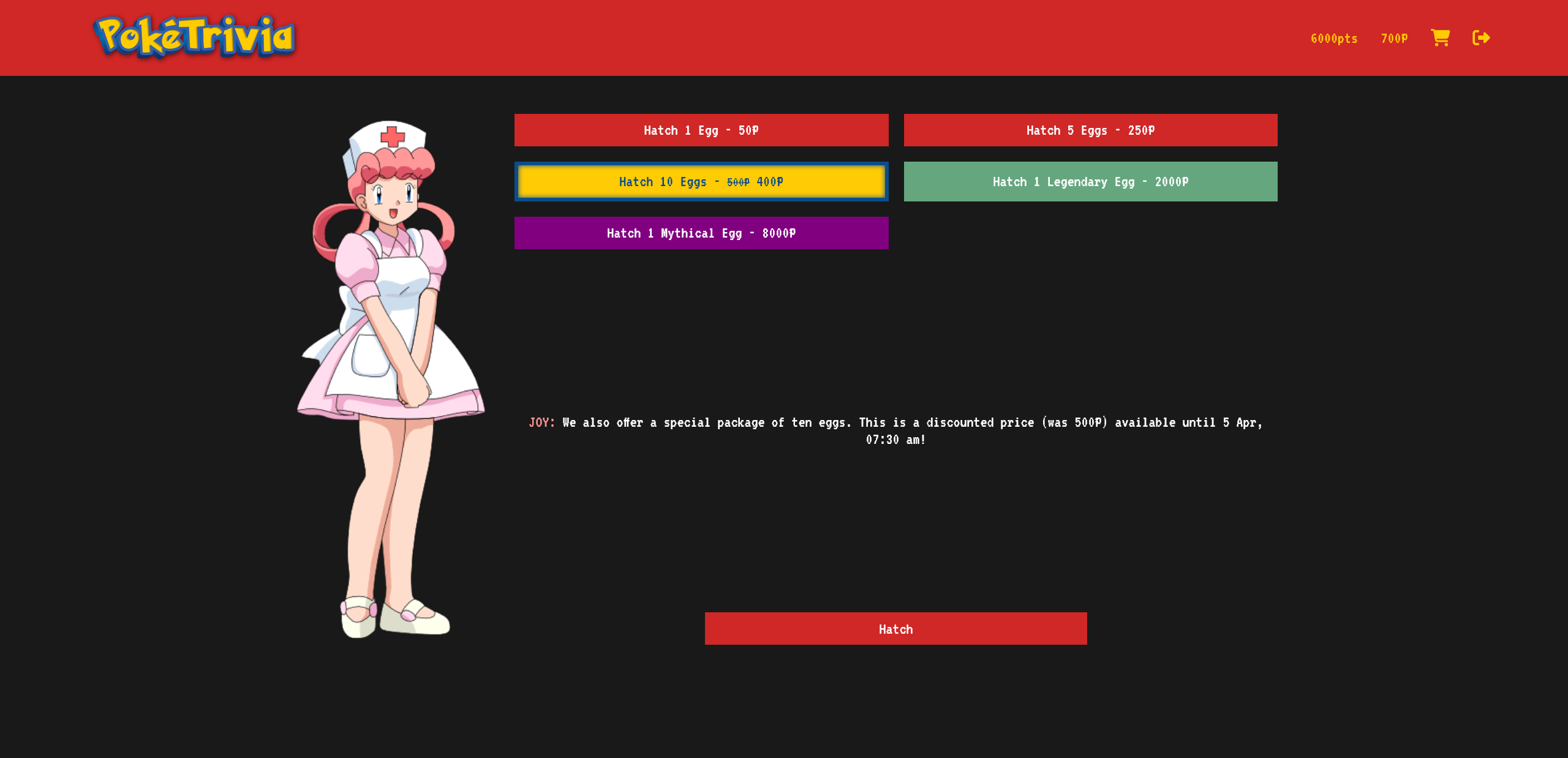 - Buy and hatch egg(s) to recieve random Pokémon(s)