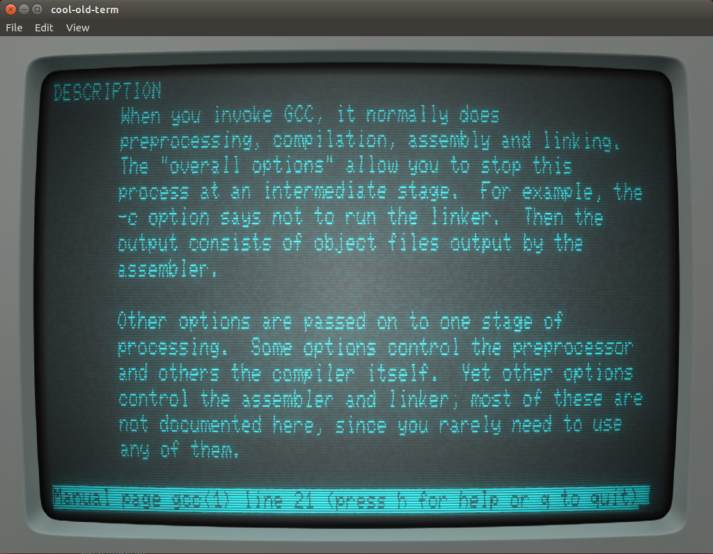 ##Description cool-retro-term is a terminal emulator which mimics the look and feel of the old cathode tube screens. It has been designed to be eye-candy, customizable, and reasonably lightweight.