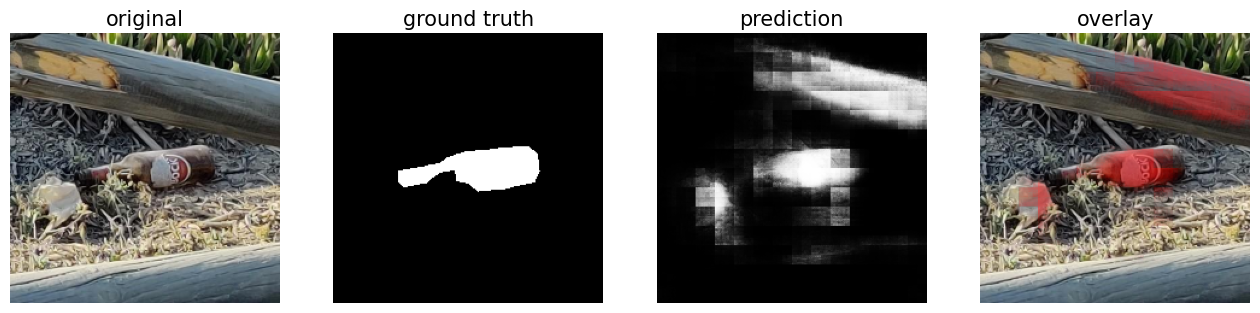Following model training, we conduct performance assessment on the test set. We compare the trained model's predictions against ground truth masks using metrics such as Intersection over Union (IoU) to quantify segmentation accuracy. Here below, we display two predictions made by our model: one with a poor performance, where the contour of the bottle is difficult to make out against the object backgroun, and one where the contours of the bottle are almost perfectly predicted.