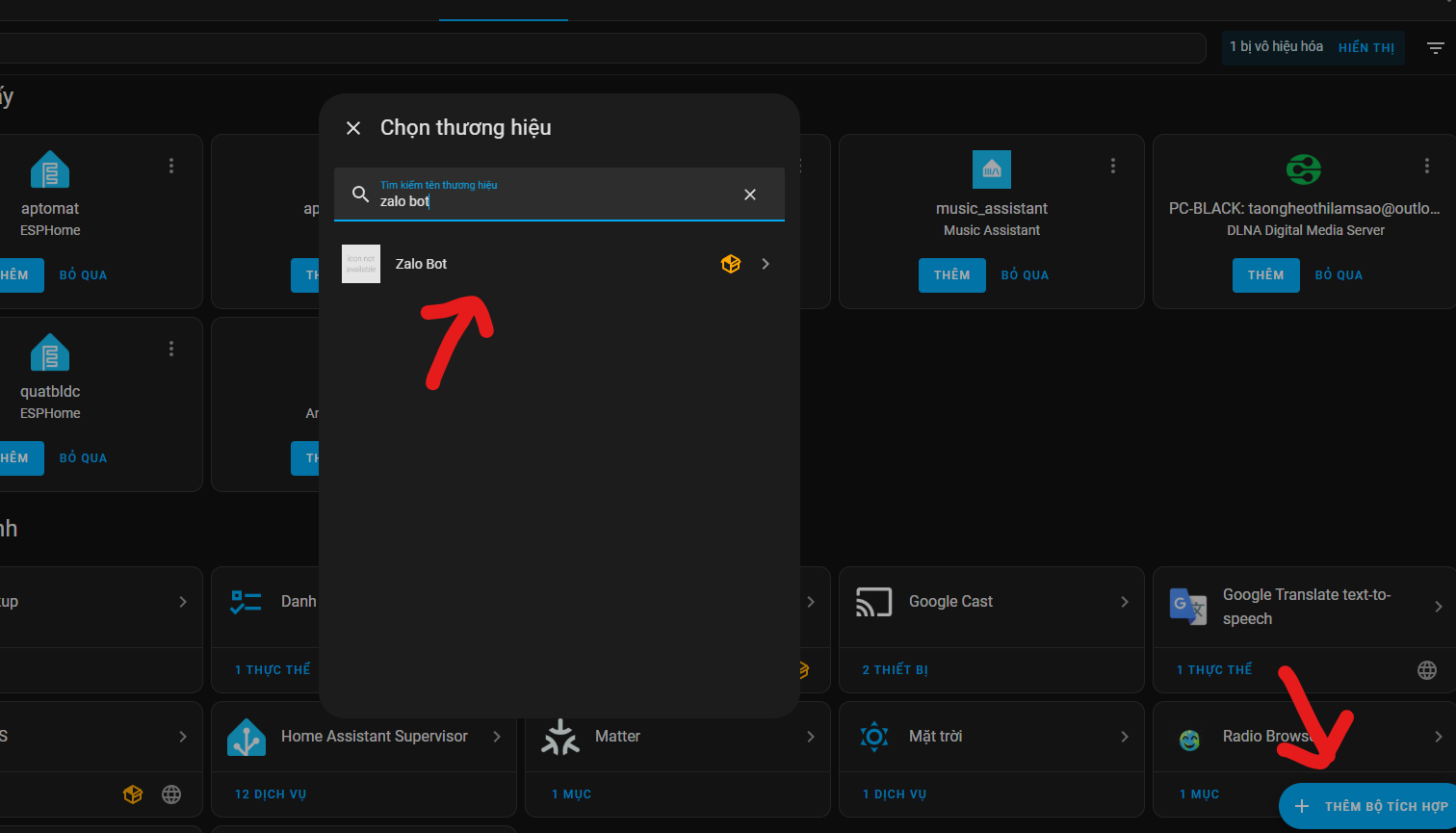 - Vào Cài đặt > Thiết bị & Dịch vụ > Thêm tích hợp mới > Chọn "Zalo Bot" và cấu hình theo hướng dẫn.
