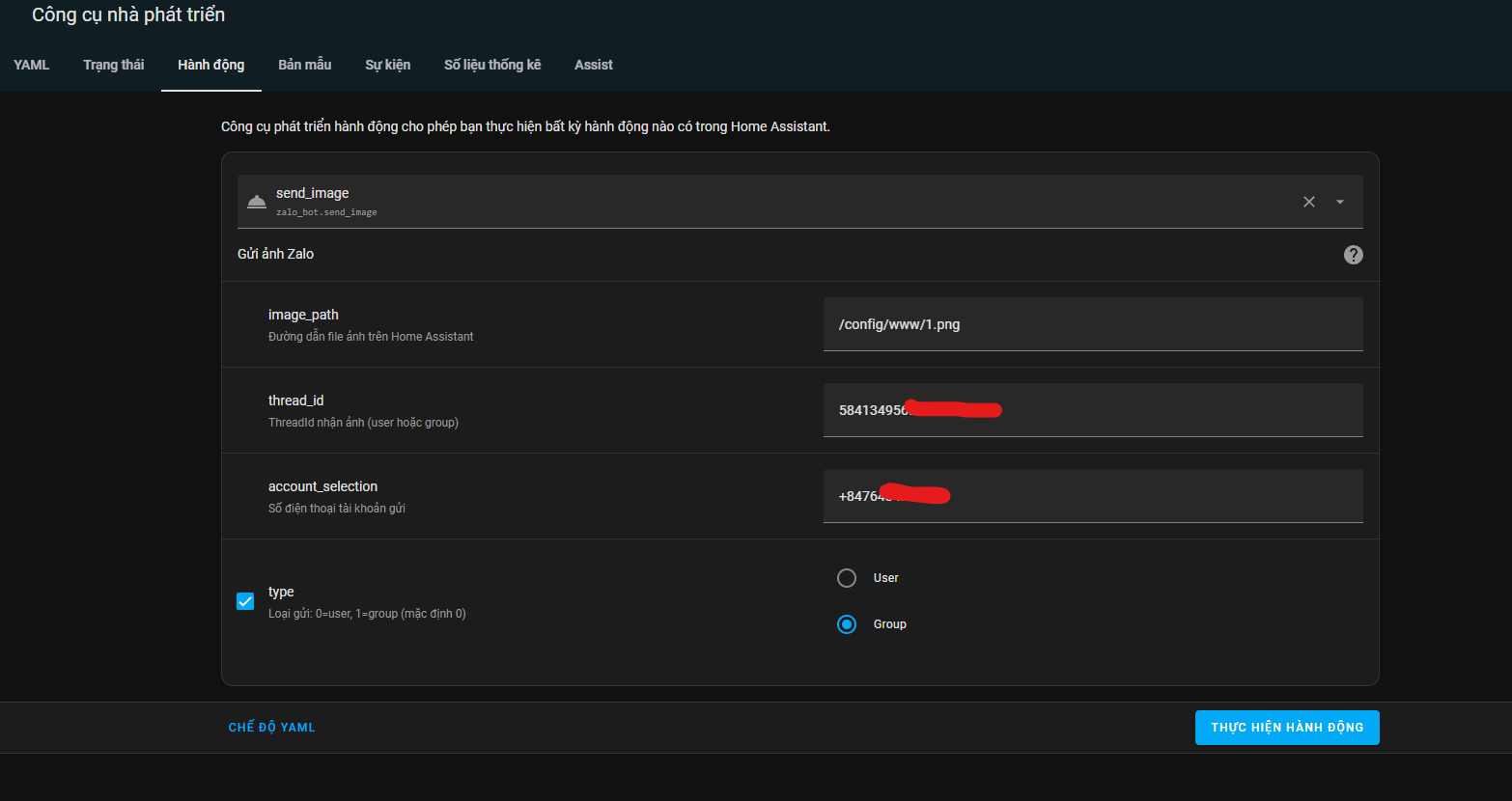 - Có 2 dịch vụ chính để dùng tự động hóa là zalo_bot.send_image và zalo_bot.send_message