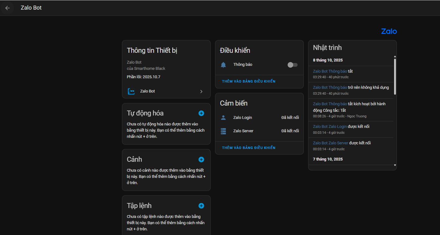 Dự án này cung cấp một bot Zalo tích hợp cho Home Assistant, giúp bạn gửi, nhận thông báo và điều khiển thiết bị qua Zalo một cách tiện lợi!