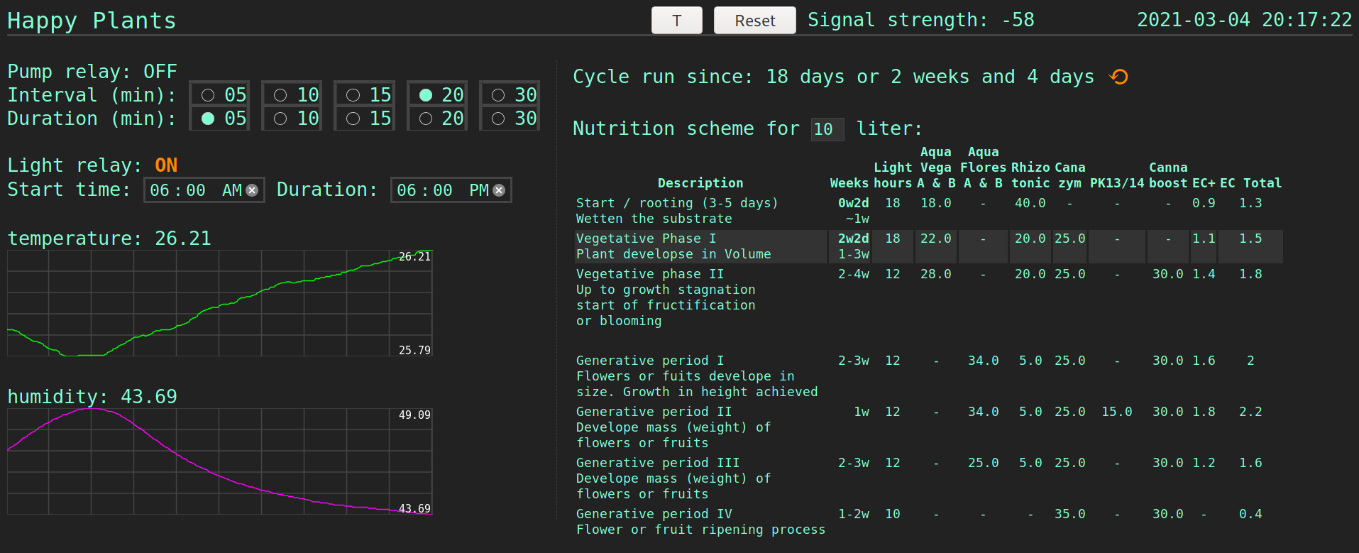 It is a bit more complicated to switch the light on and off. The same is valid for a water pump. With the happy plant firmware, it is possible to trigger the switches via two separated relays. The timing intervals are easy to setup via the web interface, which looks like this: