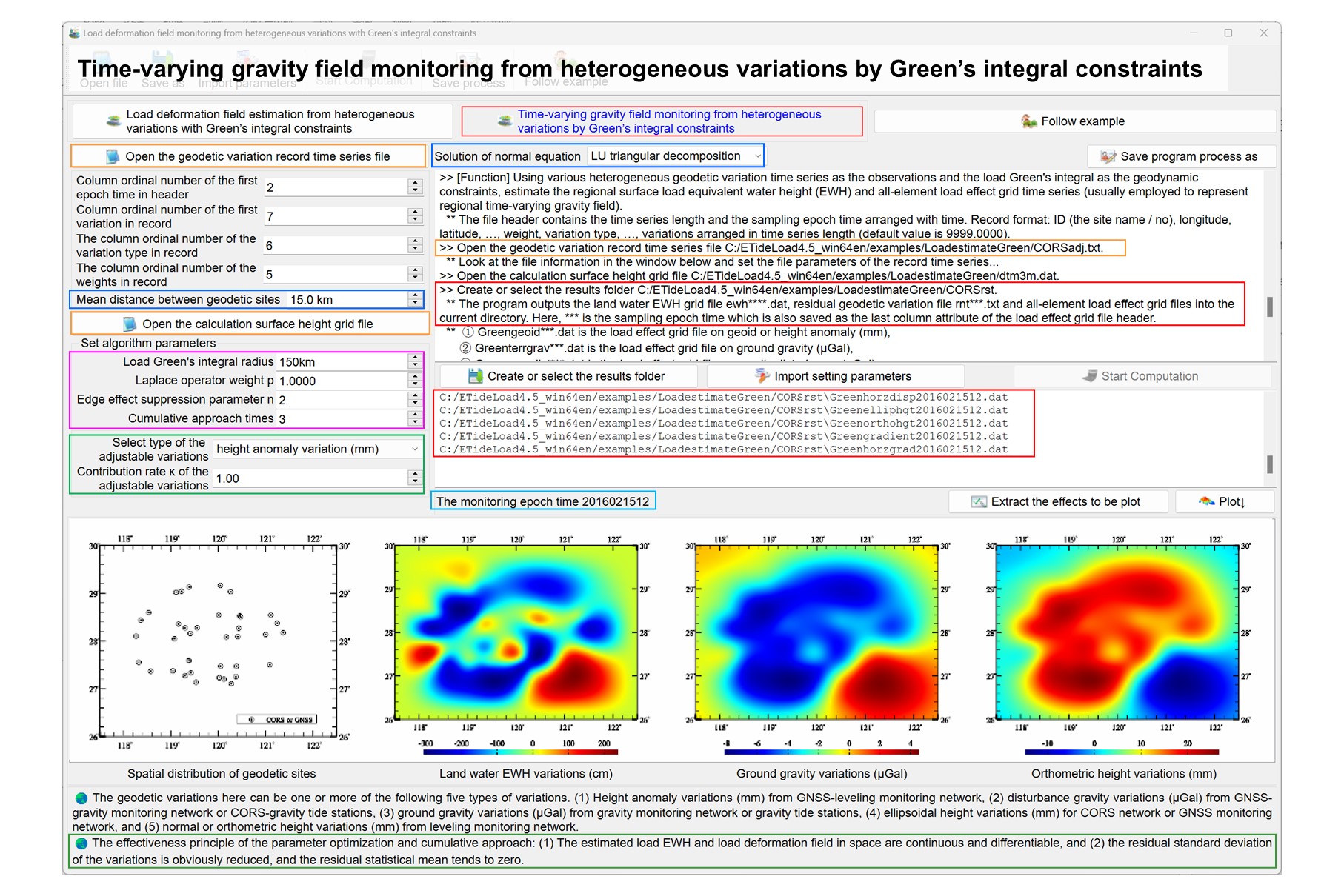 longitude, latitude, …, weight, variation type, …, variations arranged in time series length (default value is 9999.0000). Variation type = 1 represents the height anomaly variation (mm), = 2 represents gravity disturbance variation (μGal), = 3 represents ground gravity variation (μGal), = 4 represents ground ellipsoidal height variation (mm), and = 5 represents normal or orthometric height variation (mm). Input parameters: dtmfl - The calculation surface height grid file name. The calculation surface height is the height of the calculation point relative to the ground surface. When calculating the ground load deformation field, enter the zero-value grid. The calculation surface height grid specification is employed to specify the latitude and longitude range and spatial resolution of the land water EWH grid to be estimated. The program requires that the grid range of the calculation surface height must be larger than the geodetic site distribution range to absorb the edge effect. The actual effective range of the land water EWH and its load deformation field grid to be estimated will be less than the coverage range of these geodetic sites. Input parameters: lnth,dr - the mean distance (m) between geodetic sites and Green's integral radius (m). Input parameters: lvb,itern - the Laplace operator weight and cumulative approach times. Input parameter: nfar - the edge effect suppression parameter. Input parameter: knd - the method of the solution of normal equation, knd=1 LU triangular decomposition method, =2 Cholesky decomposition, =3 least square qr decomposition, =4 Minimum norm singular value decomposition. Input parameter: hepch - the column ordinal number of the first epoch time in header. Input parameter: frow - the column ordinal number of the first variation in record. Input parameter: kndrow - the column ordinal number of the variation type in record. Input parameter: wghrow - the column ordinal number of the variation weight in record.